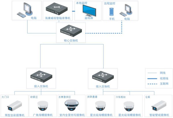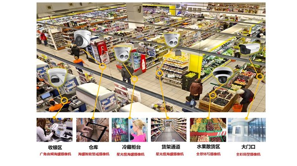 方案覆蓋場(chǎng)景:大門口、收銀臺(tái)、貨架、冷藏柜臺(tái)、水果散貨區(qū)、倉(cāng)庫等重點(diǎn)監(jiān)控區(qū)域。其中: